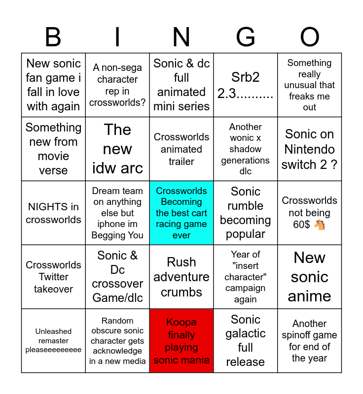 This bingo card has a free space and 24 words: Sonic & Dc crossover Game/dlc, Random obscure sonic character gets acknowledge in a new media, Crossworlds animated trailer, Unleashed remaster pleaseeeeeeeee, Something really unusual that freaks me out, New sonic fan game i fall in love with again, Something new from movie verse, A non-sega character rep in crossworlds?, Sonic rumble becoming popular, Rush adventure crumbs, Another wonic x shadow generations dlc, NIGHTS in crossworlds, Year of "insert character" campaign again, New sonic anime, The new idw arc, Sonic galactic full release, Crossworlds not being 60$ 🐴, Sonic & dc full animated mini series, Sonic on Nintendo switch 2 ?, Dream team on anything else but iphone im Begging You, Another spinoff game for end of the year, Crossworlds Twitter takeover, Srb2 2.3.......... and Koopa finally playing sonic mania.