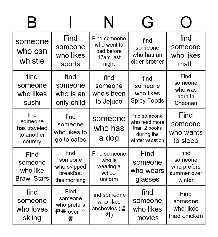 This bingo card has 50 words: Find someone who can whistle, someone who has a dog, someone who's Has a birthday in the same month as you, find someone who likes anchovies (멸치), find someone who skipped breakfast this morning, Find someone who likes Pikmin, Find someone who likes sports, find someone who likes traveling, find someone who likes sushi, find someone who can sew, find someone who is an only child, find someone who has an older brother, find someone who prefers summer over winter, Find someone who wears glasses, find someone who likes sushi, find someone who likes English, find someone who's been to Jejudo, find someone who read more than 2 books during the winter vacation, find someone who has a younger sister., find someone who likes math, find someone who likes to go to cafes, find someone who likes movies, someone who can whistle, find someone who likes Spicy Foods, find someone who is left-handed, Find someone who likes fried chicken, Find someone who was born in Cheonan, Find someone who likes to dance, Find someone who went to bed before 12am last night, Find someone who is wearing a school uniform, Find someone who wears black shoes, Find someone who likes English pop songs, Find someone who can swim, Find someone who likes mint chocolate, Find someone who prefers 팥붕 over 슈붕, Find someone who has a Galaxy phone, Find someone who can do more than 3 push-ups., Find someone who rides a bike, Find someone who wants to go home now, Find someone who wants to sleep, find someone who plays an instrument, find someone who likes starbucks, find someone who can drink coffee, find someone who likes watching Netflix, find someone who loves skiing, find someone has traveled to another country, find someone who likes to play online games, find someone who woke up before 7 AM today, Find someone who like Brawl Stars and Find someone who can cook.
