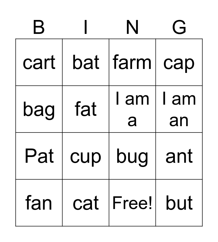 This bingo card has 17 words: Free!, fan, farm, cart, cup, cap, ant, I am a, I am an, fat, cat, bug, bag, bat, Pat, sad and but.