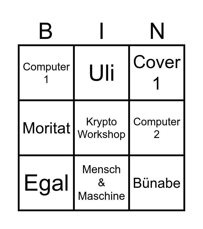 This bingo card has 13 words: Freitag, Pamphlet, Egal, Uli, Moritat, Krypto Workshop, Bünabe, Iro, Mensch & Maschine, Computer 1, Computer 2, Cover 1 and Cover 2.