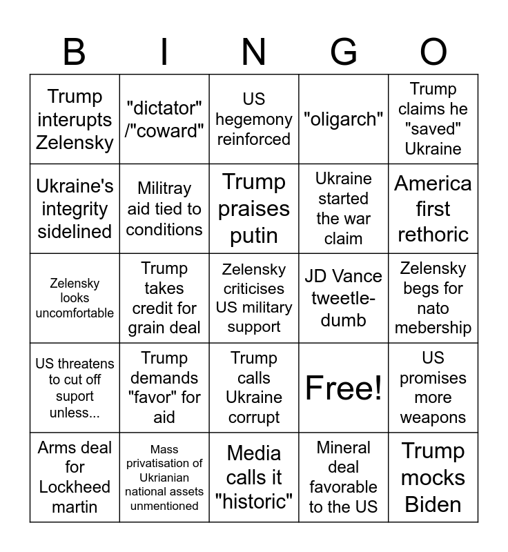 This bingo card has 25 words: Trump demands "favor" for aid, Media calls it "historic", Trump praises putin, Arms deal for Lockheed martin, Trump claims he "saved" Ukraine, Trump interupts Zelensky, Ukraine's integrity sidelined, "dictator" /"coward", JD Vance tweetle-dumb, Trump calls Ukraine corrupt, Ukraine started the war claim, Zelensky looks uncomfortable, Free!, US promises more weapons, Militray aid tied to conditions, Trump mocks Biden, Zelensky begs for nato mebership, US hegemony reinforced, America first rethoric, Trump takes credit for grain deal, Zelensky criticises US military support, Mass privatisation of Ukrianian national assets unmentioned, US threatens to cut off suport unless..., "oligarch" and Mineral deal favorable to the US.