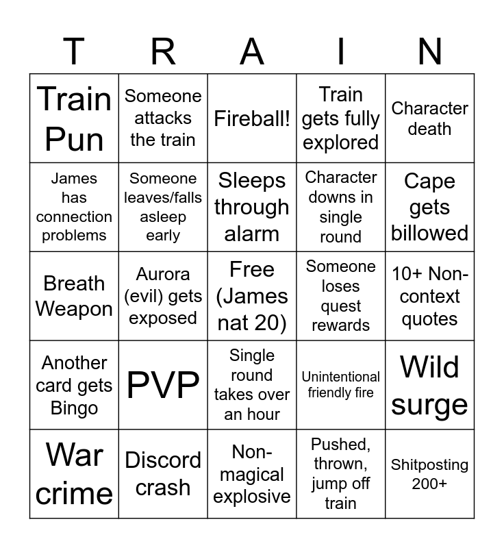 This bingo card has a free space and 24 words: PVP, Discord crash, Sleeps through alarm, War crime, Character death, Train Pun, James has connection problems, Someone attacks the train, Someone loses quest rewards, Single round takes over an hour, Character downs in single round, Breath Weapon, Unintentional friendly fire, Wild surge, Someone leaves/falls asleep early, Pushed, thrown, jump off train, 10+ Non-context quotes, Fireball!, Cape gets billowed, Aurora (evil) gets exposed, Shitposting 200+, Another card gets Bingo, Train gets fully explored and Non-magical explosive.