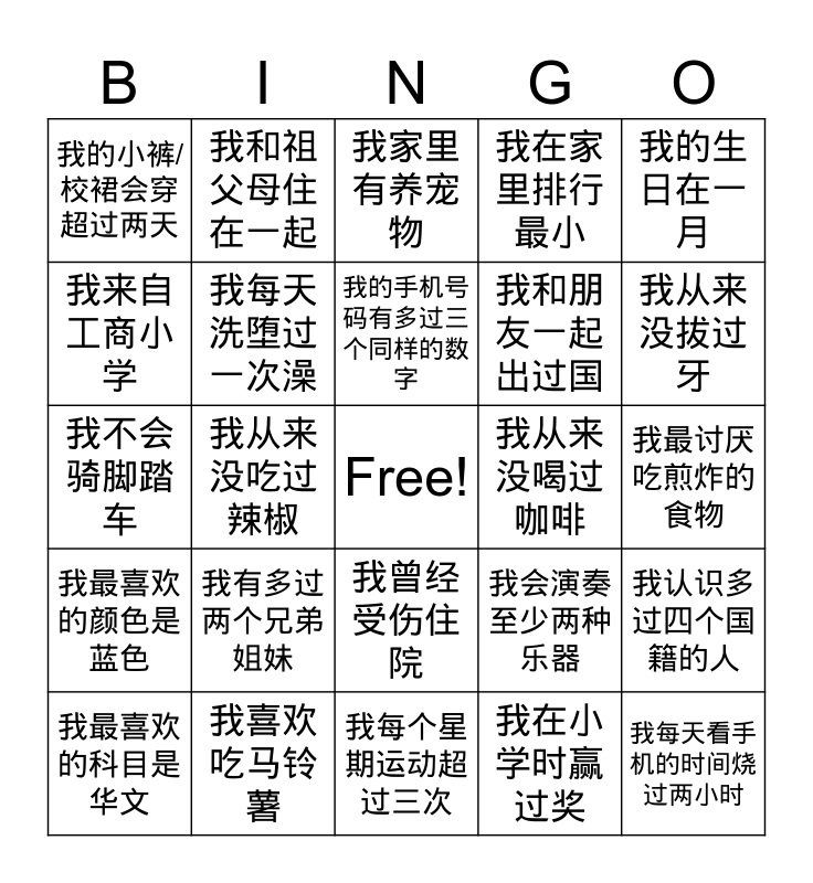This bingo card has a free space and 24 words: 我有多过两个兄弟姐妹, 我喜欢吃马铃薯, 我的手机号码有多过三个同样的数字, 我最喜欢的科目是华文, 我的生日在一月, 我的小裤/校裙会穿超过两天, 我来自工商小学, 我和祖父母住在一起, 我从来没喝过咖啡, 我曾经受伤住院, 我和朋友一起出过国, 我不会骑脚踏车, 我会演奏至少两种乐器, 我认识多过四个国籍的人, 我每天洗堕过一次澡, 我在小学时赢过奖, 我最讨厌吃煎炸的食物, 我家里有养宠物, 我从来没拔过牙, 我从来没吃过辣椒, 我每天看手机的时间烧过两小时, 我最喜欢的颜色是蓝色, 我在家里排行最小 and 我每个星期运动超过三次.