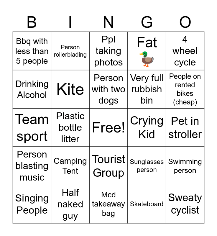 This bingo card has a free space and 24 words: Camping Tent, Half naked guy, Person with two dogs, Singing People, 4 wheel cycle, Bbq with less than 5 people, Drinking Alcohol, Person rollerblading, Crying Kid, Tourist Group, Very full rubbish bin, Team sport, Sunglasses person, Swimming person, Kite, Skateboard, Pet in stroller, Ppl taking photos, People on rented bikes (cheap), Plastic bottle litter, Sweaty cyclist, Person blasting music, Fat🦆 and Mcd takeaway bag.
