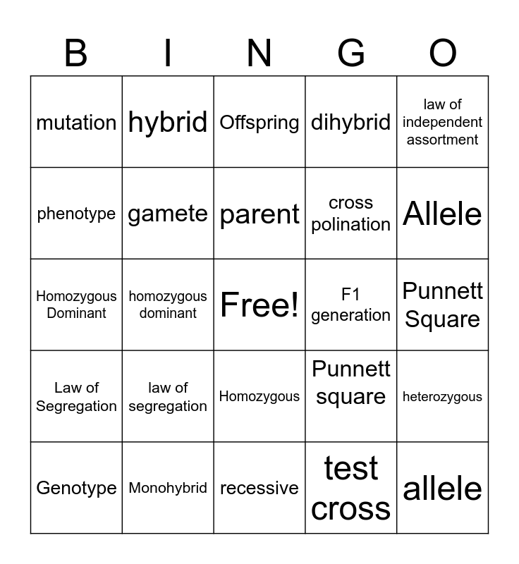 This bingo card has a free space and 48 words: dominant, allele, genotype, recessive, law of segregation, homozygous, hybrid, gene, phenotype, monohybrid, gamete, dihybrid, heterozygous, Punnett square, independent assortment, trait, parent, F1 generation, offspring, law of independent assortment, homozygous dominant, test cross, mutation, cross polination, Dominant, Allele, Genotype, Recessive, Homozygous, Law of Segregation, Hybrid, Heterozygous, Gene, Phenotype, Monohybrid, Gamete, Dihybrid, Punnett Square, Independent Assortment, Trait, Parent, F1 Generation, Offspring, Law of Independent Assortment, Homozygous Dominant, Test Cross, Mutation and Cross-Pollination.