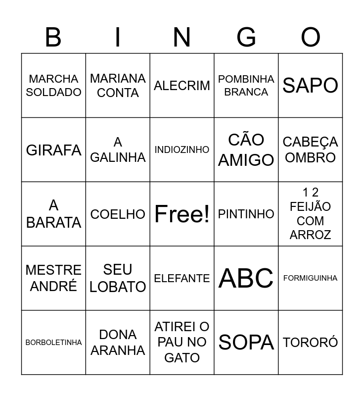 This bingo card has a free space and 24 words: SEU LOBATO, DONA ARANHA, INDIOZINHO, BORBOLETINHA, SAPO, MARCHA SOLDADO, GIRAFA, MARIANA CONTA, PINTINHO, ELEFANTE, CÃO AMIGO, A BARATA, ABC, FORMIGUINHA, A GALINHA, SOPA, 1 2 FEIJÃO COM ARROZ, ALECRIM, CABEÇA OMBRO, COELHO, TORORÓ, MESTRE ANDRÉ, POMBINHA BRANCA and ATIREI O PAU NO GATO.
