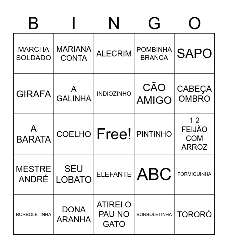 This bingo card has a free space and 24 words: SEU LOBATO, DONA ARANHA, INDIOZINHO, BORBOLETINHA, SAPO, MARCHA SOLDADO, GIRAFA, MARIANA CONTA, PINTINHO, ELEFANTE, CÃO AMIGO, A BARATA, ABC, FORMIGUINHA, A GALINHA, BORBOLETINHA, 1 2 FEIJÃO COM ARROZ, ALECRIM, CABEÇA OMBRO, COELHO, TORORÓ, MESTRE ANDRÉ, POMBINHA BRANCA and ATIREI O PAU NO GATO.