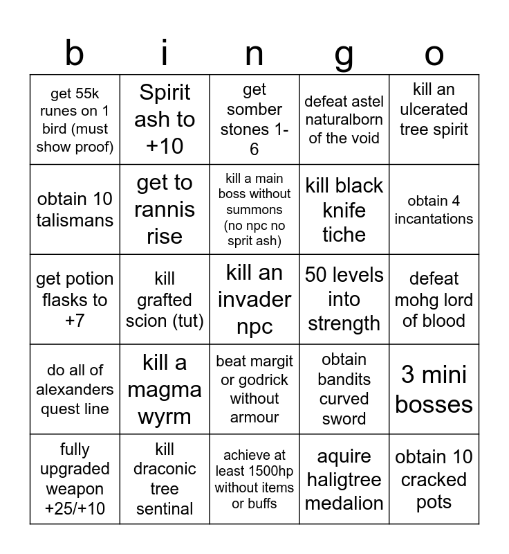 This bingo card has 25 words: kill a magma wyrm, achieve at least 1500hp without items or buffs, kill a main boss without summons (no npc no sprit ash), fully upgraded weapon +25/+10, kill an ulcerated tree spirit, get 55k runes on 1 bird (must show proof), obtain 10 talismans, Spirit ash to +10, 50 levels into strength, beat margit or godrick without armour, kill black knife tiche, get potion flasks to +7, obtain bandits curved sword, 3 mini bosses, get to rannis rise, obtain 10 cracked pots, defeat mohg lord of blood, get somber stones 1-6, obtain 4 incantations, kill grafted scion (tut), kill an invader npc, kill draconic tree sentinal, do all of alexanders quest line, defeat astel naturalborn of the void and aquire haligtree medalion.