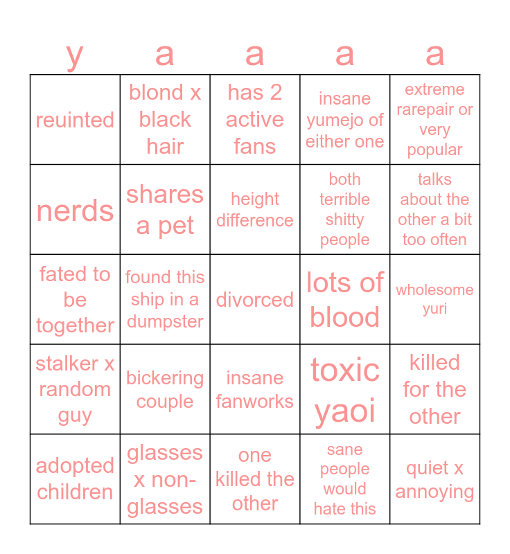 This bingo card has 25 words: bickering couple, one killed the other, height difference, adopted children, extreme rarepair or very popular, reuinted, nerds, blond x black hair, lots of blood, insane fanworks, both terrible shitty people, fated to be together, toxic yaoi, killed for the other, shares a pet, quiet x annoying, wholesome yuri, has 2 active fans, talks about the other a bit too often, found this ship in a dumpster, divorced, glasses x non-glasses, stalker x random guy, insane yumejo of either one and sane people would hate this.