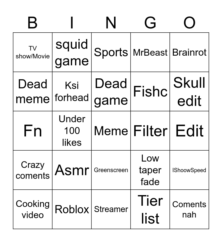This bingo card has a free space and 24 words: Asmr, Roblox, Dead game, Cooking video, Brainrot, TV show/Movie, Dead meme, squid game, Filter, Greenscreen, Fishc, Fn, Low taper fade, IShoowSpeed, Ksi forhead, Tier list, Edit, Sports, Skull edit, Under 100 likes, Coments nah, Crazy coments, MrBeast and Streamer.