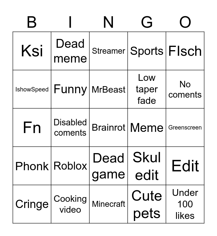 This bingo card has a free space and 24 words: Roblox, Cooking video, MrBeast, Cringe, FIsch, Ksi, IshowSpeed, Dead meme, Meme, Dead game, Low taper fade, Fn, Skul edit, Edit, Funny, Cute pets, Greenscreen, Streamer, No coments, Disabled coments, Under 100 likes, Phonk, Sports and Minecraft.