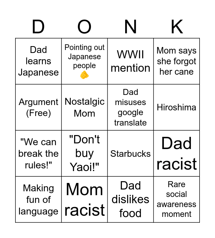 This bingo card has 16 words: Mom racist, Dad racist, WWII mention, Dad learns Japanese, "We can break the rules!", Pointing out Japanese people 🫵, Starbucks, Dad dislikes food, Argument (Free), Nostalgic Mom, Making fun of language, Mom says she forgot her cane, "Don't buy Yaoi!", Hiroshima, Dad misuses google translate and Rare social awareness moment.