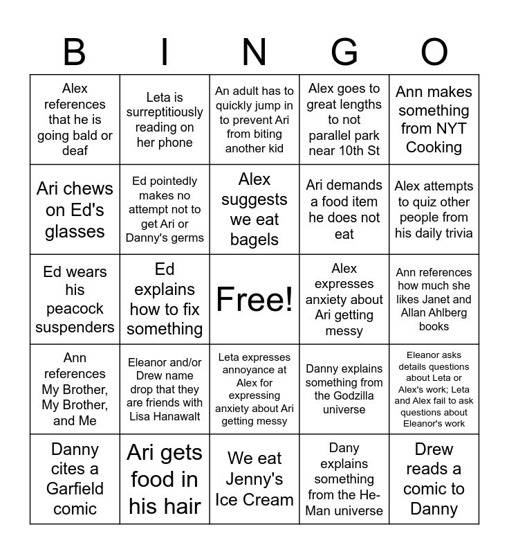 This bingo card has a free space and 24 words: Eleanor and/or Drew name drop that they are friends with Lisa Hanawalt, Ari gets food in his hair, Alex suggests we eat bagels, Danny cites a Garfield comic, Ann makes something from NYT Cooking, Alex references that he is going bald or deaf, Ari chews on Ed's glasses, Leta is surreptitiously reading on her phone, Alex expresses anxiety about Ari getting messy, Leta expresses annoyance at Alex for expressing anxiety about Ari getting messy, Ari demands a food item he does not eat, Ed wears his peacock suspenders, Danny explains something from the Godzilla universe, Eleanor asks details questions about Leta or Alex's work; Leta and Alex fail to ask questions about Eleanor's work, Ed pointedly makes no attempt not to get Ari or Danny's germs, Dany explains something from the He-Man universe, Ann references how much she likes Janet and Allan Ahlberg books, An adult has to quickly jump in to prevent Ari from biting another kid, Alex attempts to quiz other people from his daily trivia, Ed explains how to fix something, Drew reads a comic to Danny, Ann references My Brother, My Brother, and Me, Alex goes to great lengths to not parallel park near 10th St and We eat Jenny's Ice Cream.