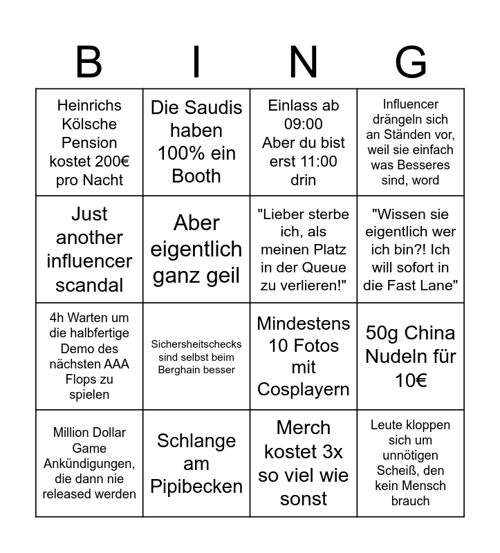 This bingo card has 16 words: Schlange am Pipibecken, 50g China Nudeln für 10€, Einlass ab 09:00 Aber du bist erst 11:00 drin, Heinrichs Kölsche Pension kostet 200€ pro Nacht, 4h Warten um die halbfertige Demo des nächsten AAA Flops zu spielen, Die Saudis haben 100% ein Booth, Mindestens 10 Fotos mit Cosplayern, Merch kostet 3x so viel wie sonst, Just another influencer scandal, Aber eigentlich ganz geil, Million Dollar Game Ankündigungen, die dann nie released werden, Influencer drängeln sich an Ständen vor, weil sie einfach was Besseres sind, word, Sichersheitschecks sind selbst beim Berghain besser, "Wissen sie eigentlich wer ich bin?! Ich will sofort in die Fast Lane", "Lieber sterbe ich, als meinen Platz in der Queue zu verlieren!" and Leute kloppen sich um unnötigen Scheiß, den kein Mensch brauch.