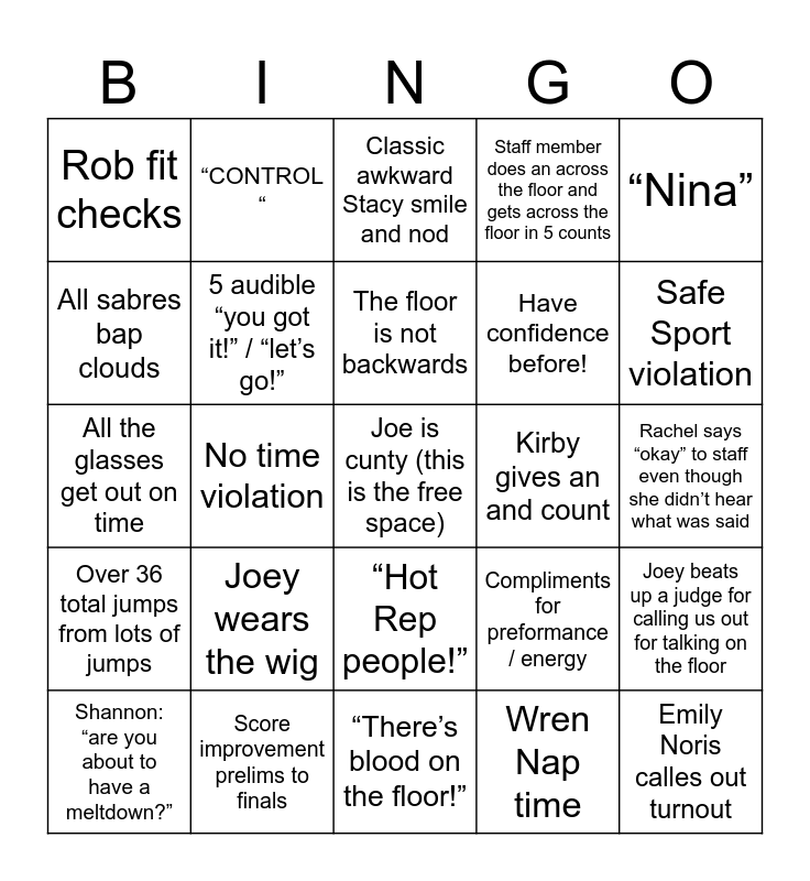 This bingo card has a free space and 24 words: Joey wears the wig, Score improvement prelims to finals, The floor is not backwards, Shannon: “are you about to have a meltdown?”, “Nina”, Rob fit checks, All sabres bap clouds, “CONTROL “, Kirby gives an and count, “Hot Rep people!”, Have confidence before!, All the glasses get out on time, Compliments for preformance / energy, Joey beats up a judge for calling us out for talking on the floor, 5 audible “you got it!” / “let’s go!”, Wren Nap time, Rachel says “okay” to staff even though she didn’t hear what was said, Classic awkward Stacy smile and nod, Safe Sport violation, No time violation, Emily Noris calles out turnout, Over 36 total jumps from lots of jumps, Staff member does an across the floor and gets across the floor in 5 counts and “There’s blood on the floor!”.