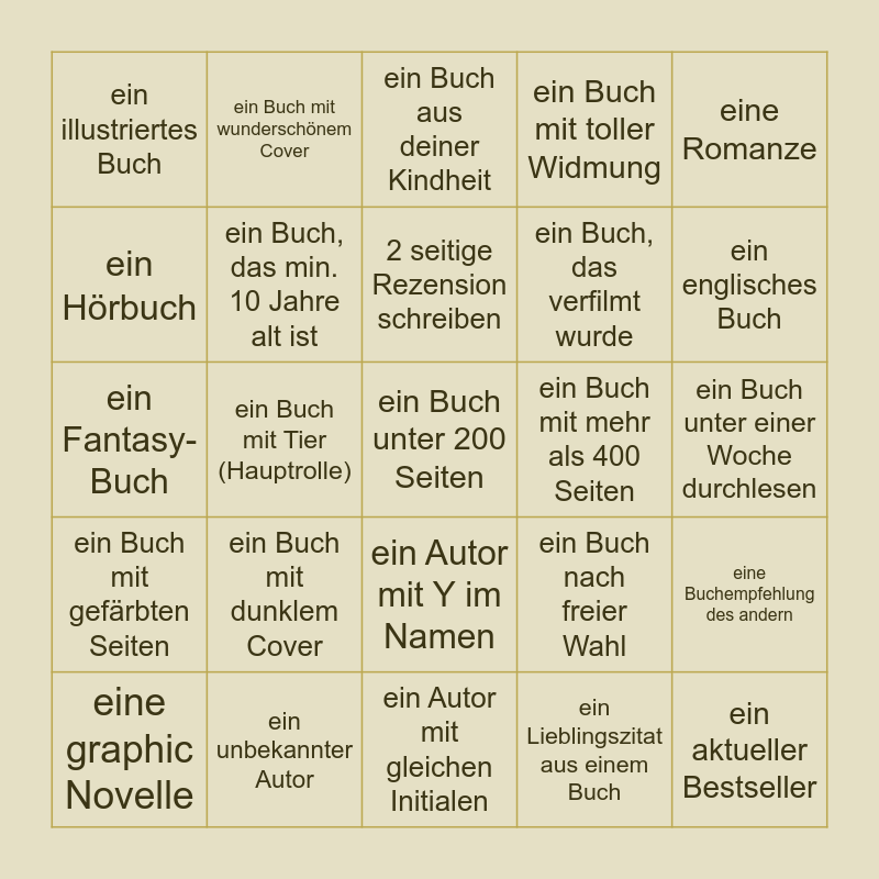 This bingo card has 25 words: ein Buch mit dunklem Cover, ein Autor mit gleichen Initialen, 2 seitige Rezension schreiben, eine graphic Novelle, eine Romanze, ein illustriertes Buch, ein Hörbuch, ein Buch mit wunderschönem Cover, ein Buch mit mehr als 400 Seiten, ein Autor mit Y im Namen, ein Buch, das verfilmt wurde, ein Fantasy-Buch, ein Buch nach freier Wahl, eine Buchempfehlung des andern, ein Buch, das min. 10 Jahre alt ist, ein aktueller Bestseller, ein Buch unter einer Woche durchlesen, ein Buch aus deiner Kindheit, ein englisches Buch, ein Buch mit Tier (Hauptrolle), ein Buch unter 200 Seiten, ein unbekannter Autor, ein Buch mit gefärbten Seiten, ein Buch mit toller Widmung and ein Lieblingszitat aus einem Buch.