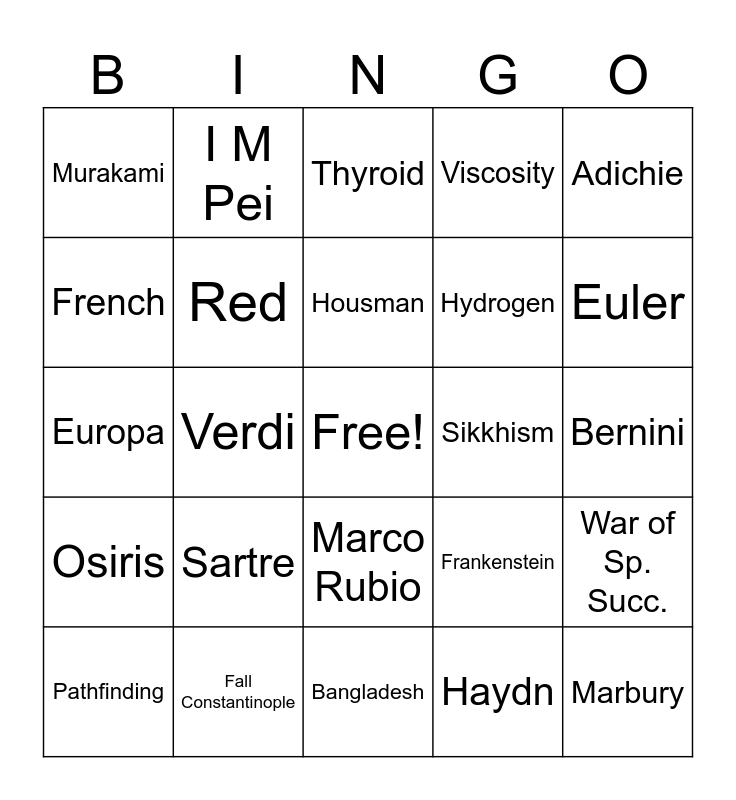 This bingo card has a free space and 24 words: Pathfinding, Sartre, Housman, Haydn, Adichie, Murakami, I M Pei, Thyroid, Sikkhism, Bernini, Europa, Red, Frankenstein, War of Sp. Succ., French, Fall Constantinople, Bangladesh, Viscosity, Euler, Osiris, Verdi, Marco Rubio, Hydrogen and Marbury.