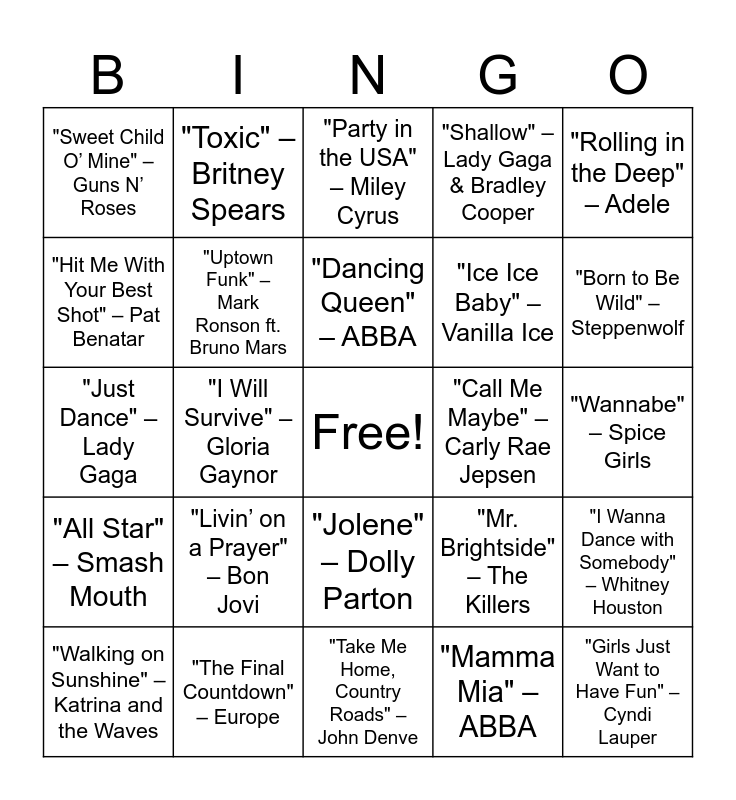 This bingo card has a free space and 37 words: "Bohemian Rhapsody" – Queen, "Don’t Stop Believin’" – Journey, "Shake It Off" – Taylor Swift, "Uptown Funk" – Mark Ronson ft. Bruno Mars, "I Wanna Dance with Somebody" – Whitney Houston, "Livin’ on a Prayer" – Bon Jovi, "Dancing Queen" – ABBA, "Sweet Caroline" – Neil Diamond, "Rolling in the Deep" – Adele, "Summer of ‘69" – Bryan Adams, "I Will Survive" – Gloria Gaynor, "Shallow" – Lady Gaga & Bradley Cooper, "Girls Just Want to Have Fun" – Cyndi Lauper, "Wannabe" – Spice Girls, "Hit Me With Your Best Shot" – Pat Benatar, "All Star" – Smash Mouth, "Can’t Stop the Feeling!" – Justin Timberlake, "Party in the USA" – Miley Cyrus, "Jolene" – Dolly Parton, "Call Me Maybe" – Carly Rae Jepsen, "Sweet Child O’ Mine" – Guns N’ Roses, "Born to Be Wild" – Steppenwolf, "Walking on Sunshine" – Katrina and the Waves, "Take Me Home, Country Roads" – John Denve, "Boogie Wonderland" – Earth, Wind & Fire, "Mamma Mia" – ABBA, "Toxic" – Britney Spears, "Hey Ya!" – OutKast, "All the Small Things" – Blink-182, "I’m Gonna Be (500 Miles)" – The Proclaimers, "Africa" – Toto, "The Final Countdown" – Europe, "Just Dance" – Lady Gaga, "Viva La Vida" – Coldplay, "Mr. Brightside" – The Killers, "Ice Ice Baby" – Vanilla Ice and "Groove Is in the Heart" – Deee-Lite.