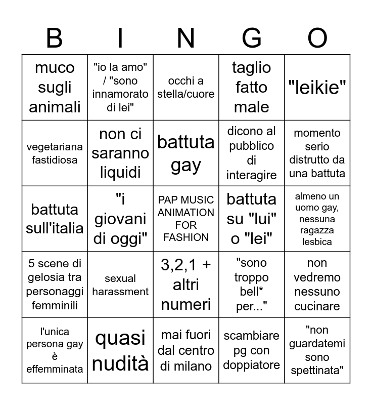This bingo card has a free space and 24 words: sexual harassment, quasi nudità, battuta gay, l'unica persona gay è effemminata, "leikie", muco sugli animali, vegetariana fastidiosa, "io la amo" / "sono innamorato di lei", battuta su "lui" o "lei", 3,2,1 + altri numeri, dicono al pubblico di interagire, battuta sull'italia, "sono troppo bell* per...", non vedremo nessuno cucinare, non ci saranno liquidi, scambiare pg con doppiatore, almeno un uomo gay, nessuna ragazza lesbica, occhi a stella/cuore, momento serio distrutto da una battuta, "i giovani di oggi", "non guardatemi sono spettinata", 5 scene di gelosia tra personaggi femminili, taglio fatto male and mai fuori dal centro di milano.