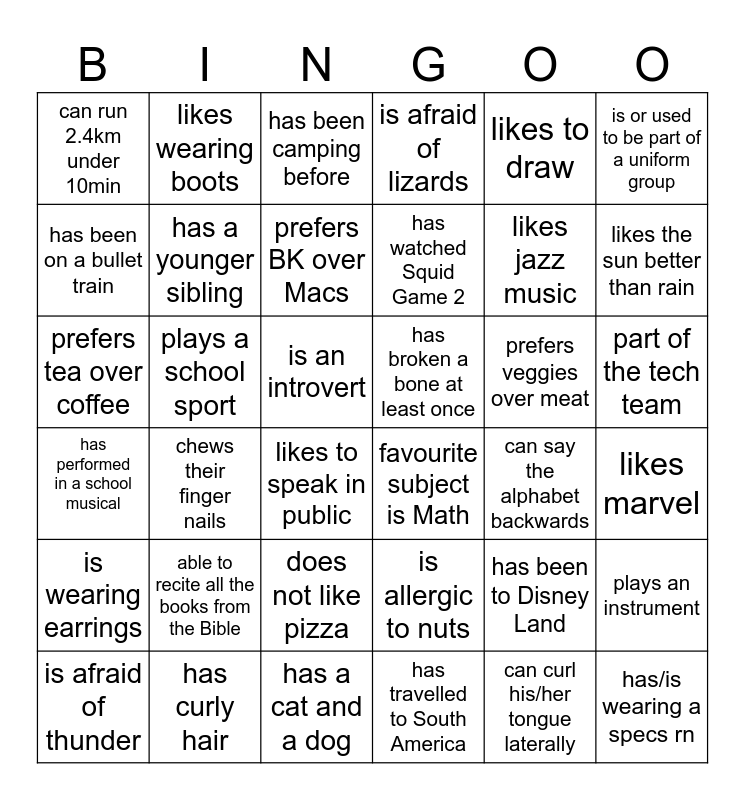 This bingo card has 36 words: is allergic to nuts, does not like pizza, has travelled to South America, has been on a bullet train, has performed in a school musical, has broken a bone at least once, has a younger sibling, has a cat and a dog, likes to draw, has been to Disney Land, likes the sun better than rain, is afraid of lizards, plays an instrument, plays a school sport, has watched Squid Game 2, can run 2.4km under 10min, is wearing earrings, prefers veggies over meat, prefers tea over coffee, has been camping before, is an introvert, chews their finger nails, favourite subject is Math, likes to speak in public, can say the alphabet backwards, likes wearing boots, likes jazz music, has curly hair, prefers BK over Macs, is or used to be part of a uniform group, has/is wearing a specs rn, is afraid of thunder, likes marvel, part of the tech team, able to recite all the books from the Bible and can curl his/her tongue laterally.