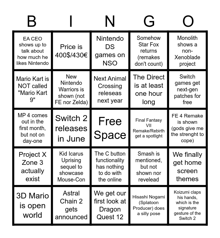This bingo card has a free space and 24 words: 3D Mario is open world, Kid Icarus Uprising sequel to showcase Mouse-Con, Next Animal Crossing releseas next year, Hisashi Nogami (Splatoon Producer) does a silly pose, Monolith shows a non-Xenoblade project, EA CEO shows up to talk about how much he likes Nintendo, Price is 400$/430€, Nintendo DS games on NSO, Final Fantasy VII Remake/Rebirth get a spotlight, FE 4 Remake is shown (gods give me the strenght to cope), MP 4 comes out in the first month, but not on day-one, New Nintendo Warriors is shown (not FE nor Zelda), Smash is mentioned, but not shown nor revelead, We finally get home screen themes, Mario Kart is NOT called "Mario Kart 9", Astral Chain 2 gets announced, We get our first look at Dragon Quest 12, Somehow Star Fox returns (remakes don't count), Switch games get next-gen patches for free, Project X Zone 3 actually exist, Switch 2 releases in June, The C button functionality has nothing to do with the online, The Direct is at least one hour long and Koizumi claps his hands, which is the signature gesture of the Switch 2.