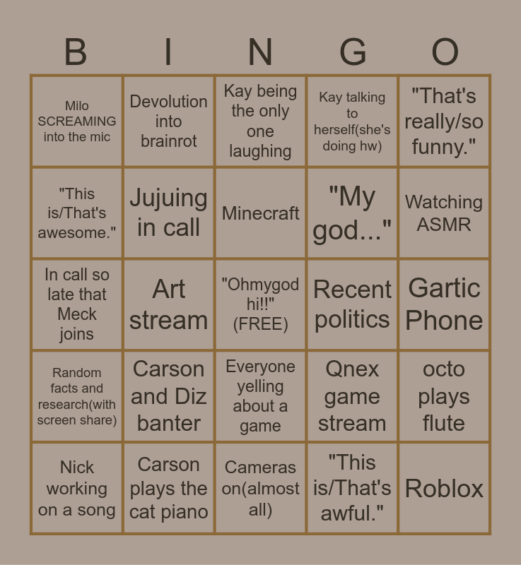 This bingo card has a free space and 28 words: octo plays flute, *Gasp* "Who joined!?" "Oh it's ___", "My god...", "This is/That's awful.", "This is/That's awesome.", Kay being the only one laughing, Devolution into brainrot, Random facts and research(with screen share), Recent politics, Nick working on a song, In call so late that Meck joins, Kay talking to herself(she's doing hw), Carson plays the cat piano, Cameras on(almost all), Watching ASMR, Carson is the only one not muted, Carson and Diz banter, Jujuing in call, Minecraft, Everyone yelling about a game, Milo SCREAMING into the mic, octo going insane, Roblox, Art stream, Gartic Phone, Qnex game stream, "That's really/so funny." and Amongus.