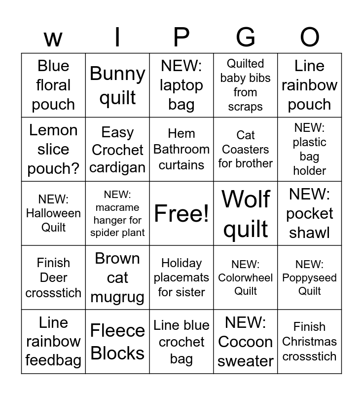 This bingo card has a free space and 24 words: Brown cat mugrug, Fleece Blocks, Hem Bathroom curtains, Line rainbow feedbag, Line rainbow pouch, Blue floral pouch, Lemon slice pouch?, Bunny quilt, Wolf quilt, Holiday placemats for sister, Cat Coasters for brother, NEW: Halloween Quilt, NEW: Colorwheel Quilt, NEW: Poppyseed Quilt, Easy Crochet cardigan, NEW: Cocoon sweater, NEW: pocket shawl, NEW: laptop bag, NEW: plastic bag holder, NEW: macrame hanger for spider plant, Finish Christmas crossstich, Finish Deer crossstich, Quilted baby bibs from scraps and Line blue crochet bag.
