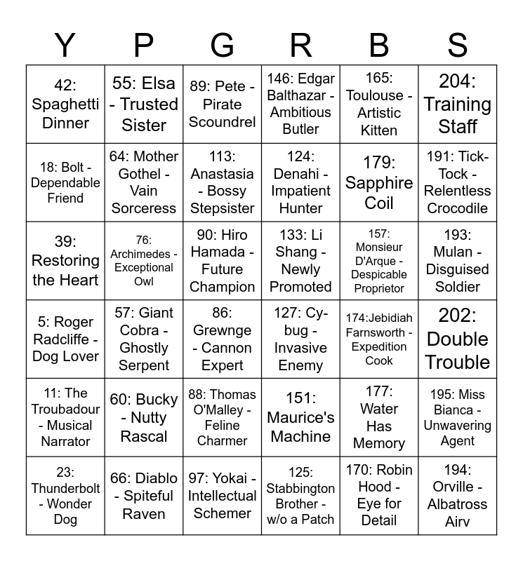 This bingo card has 126 words: 3: King Stefan - New Father, 46: Tanana - Tribal Elder, 85: Drizella - Spoiled Stepsister, 121: Grandmother Fa - Spirited Elder, 155: Mattias - Arendelle General, 181: Dr. Calico - Green-Eyed Man, 5: Roger Radcliffe - Dog Lover, 47: Treasure Guardian, 86: Grewnge - Cannon Expert, 122: Queen of Hearts - Losing Her Temper, 156: Moana - Adventurer of Land and Sea, 182: Akela - Wolf Pack Elder, 6: Trusty - Loyal Bloodhound, 48: Honeymaren - Northuldra Guide, 87: Baymax - Low Battery, 123: The Matchmaker - Unforgiving Expert, 157: Monsieur D'Arque - Despicable Proprietor, 183: Helga Sinclair - Tough as Nails, 7: Peg - Natural Performer, 53: Madame Medusa - Diamond Lover, 88: Thomas O'Malley - Feline Charmer, 124: Denahi - Impatient Hunter, 158: Gaetan Moliere - The Mole, 184: Bolt - Headstrong Dog, 8: Suzy - Master Seamstress, 55: Elsa - Trusted Sister, 89: Pete - Pirate Scoundrel, 125: Stabbington Brother - w/o a Patch, 159: Belle - Apprentice Inventor, 185: HeiHei - Rambling Rooster, 11: The Troubadour - Musical Narrator, 57: Giant Cobra - Ghostly Serpent, 90: Hiro Hamada - Future Champion, 127: Cy-bug - Invasive Enemy, 163: HeiHei - Expanded Consciousness, 189: Razoul - Menacing Guard, 12: Wendy Darling - Pirate Queen, 58: Te KÄ - Lava Monster, 91: Cheshire Cat - Perplexing Feline, 128: Stabbington Brother - w/ a Patch, 165: Toulouse - Artistic Kitten, 190: Jafar - Aspiring Ruler, 13: Mirabel Madrigal - Hopeful Dreamer, 59: Yzma - Transformed Kitten, 97: Yokai - Intellectual Schemer, 129: Card Soldiers - Royal Troops, 166: Marie - Favored Kitten, 191: Tick-Tock - Relentless Crocodile, 16: Mariano Guzman - Handsome Suitor, 60: Bucky - Nutty Rascal, 99: Berlioz - Mischievous Kitten, 130: Cogsworth - Climbing Clock, 167: Pepper - Quick-Thinking Puppy, 192: Kakamora - Band of Pirates, 17: Candlehead - Dedicated Racer, 61: Pain - Impudent Imp, 100: Lady - Elegant Spaniel, 131: Toby - Dogged Companion, 168: Freckles - Good Boy, 193: Mulan - Disguised Soldier, 18: Bolt - Dependable Friend, 62: Rajah - Ghostly Tiger, 101: Yzma - Exasperated Schemer, 132: Beagle Boys - Small-Time Crooks, 169: Honey Lemon - Chemistry Whiz, 194: Orville - Albatross Airv, 19: Pascal - Garden Chameleon, 64: Mother Gothel - Vain Sorceress, 102: Pacha - Trekmate, 133: Li Shang - Newly Promoted, 170: Robin Hood - Eye for Detail, 195: Miss Bianca - Unwavering Agent, 21: Penny - Bolt's Person, 65: Sven - Keen-Eyed Reindeer, 103: Tweedle Dee & Tweedle Dum, 134: Moana - Island Explorer, 171: Penny the Orphan - Clever Child, 196: Mufasa - Respected King, 22: Fix-it Felix, Jr. - Pint-Sized Hero, 66: Diablo - Spiteful Raven, 104: Baymax - Giant Robot, 135: The Phantom Blot - Shadowy Figure, 172: Lady Kluck - Protective Confidant, 202: Double Trouble, 23: Thunderbolt - Wonder Dog, 71: Kuzco - Panicked Llama, 105: Gizmoduck - Suited Up, 144: Sir Kay - Unruly Knight, 174:Jebidiah Farnsworth - Expedition Cook, 203: Steel Coil, 24: The Prince - Vigilant Suitor, 72: Anna - Ice Breaker, 106: Fidget - Sneaky Bat, 146: Edgar Balthazar - Ambitious Butler, 177: Water Has Memory, 204: Training Staff, 32: Perla - Nimble Seamstress, 75: Panic - High-Strung Imp, 107: Mr. Smee - Efficient Captain, 148: Out Of Order, 179: Sapphire Coil, 33: Snow White - Fairest in the Land, 76: Archimedes - Exceptional Owl, 112: Duchess - Elegant Feline, 149: Ruby Coil, 180: Baymax's Charging Station, 34: Koda - Smallish Bear, 77: Kashekim - Ancient Ruler, 113: Anastasia - Bossy Stepsister, 150: Unconventional Tool, 36: Calhoun - Battle-Tested, 78: Dolores Madrigal - Within Earshot, 116: Wake Up, Alice!, 151: Maurice's Machine, 37: Pepa Madrigal - Sensitive Sister, 79: Mufasa - Among the Stars, 117: He's a Tramp, 38: So Much To Give, 80: Magical Maneuvers, 120: Emerald Coil, 39: Restoring the Heart, 81: This Is My Family, 41: Amber Coil, 84: Amethyst Coil, 42: Spaghetti Dinner and 43: Kanine Krunchies.