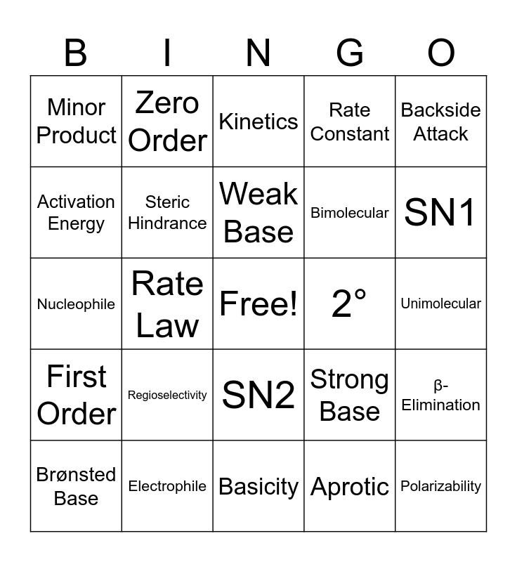 This bingo card has a free space and 24 words: Regioselectivity, Electrophile, Weak Base, Brønsted Base, Backside Attack, Minor Product, Activation Energy, Zero Order, 2°, SN2, Bimolecular, Nucleophile, Strong Base, β-Elimination, Steric Hindrance, Aprotic, Unimolecular, Kinetics, SN1, Rate Law, Polarizability, First Order, Rate Constant and Basicity.