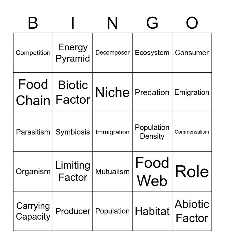 This bingo card has 26 words: Organism, Producer, Niche, Habitat, Consumer, Competition, Biotic Factor, Decomposer, Predation, Abiotic Factor, Food Chain, Symbiosis, Population, Food Web, Commensalism, Community, Energy Pyramid, Mutualism, Ecosystem, Role, Parasitism, Limiting Factor, Immigration, Population Density, Emigration and Carrying Capacity.