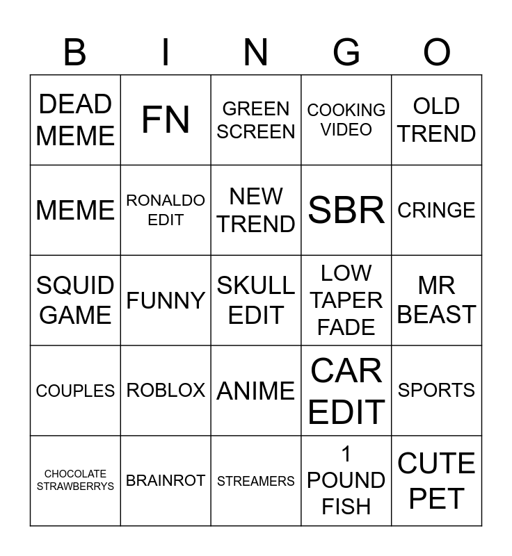 This bingo card has a free space and 24 words: ROBLOX, BRAINROT, NEW TREND, CHOCOLATE STRAWBERRYS, OLD TREND, DEAD MEME, MEME, FN, LOW TAPER FADE, ANIME, SBR, SQUID GAME, CAR EDIT, SPORTS, RONALDO EDIT, 1 POUND FISH, MR BEAST, GREEN SCREEN, CRINGE, FUNNY, CUTE PET, COUPLES, COOKING VIDEO and STREAMERS.