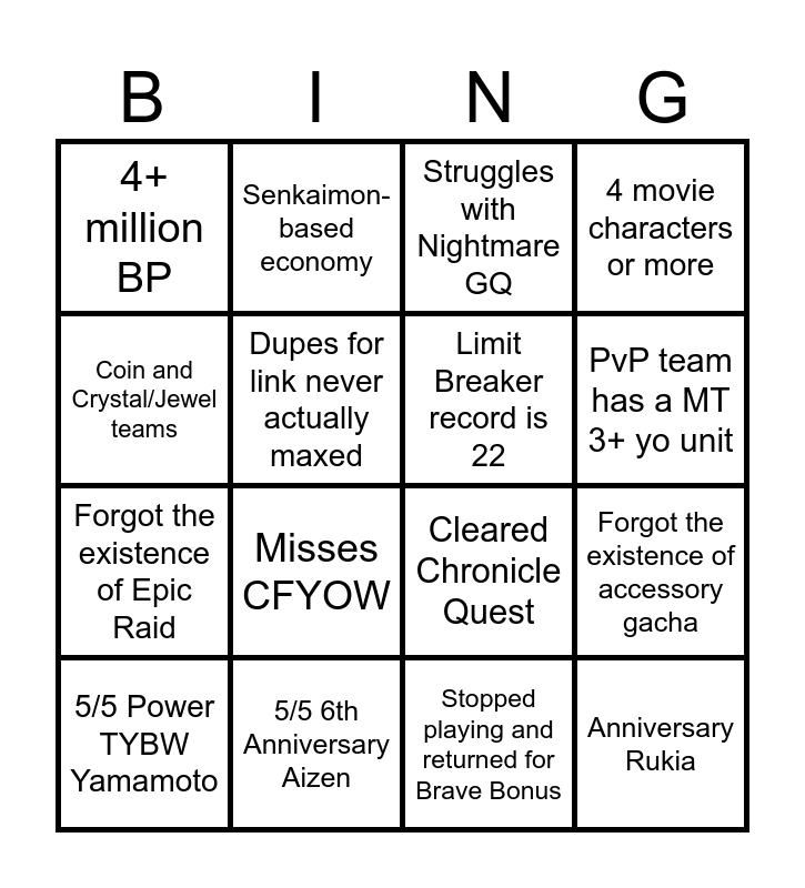This bingo card has 16 words: 5/5 6th Anniversary Aizen, Forgot the existence of accessory gacha, Struggles with Nightmare GQ, 4+ million BP, Forgot the existence of Epic Raid, Senkaimon-based economy, Cleared Chronicle Quest, Stopped playing and returned for Brave Bonus, Coin and Crystal/Jewel teams, Dupes for link never actually maxed, 5/5 Power TYBW Yamamoto, 4 movie characters or more, Misses CFYOW, PvP team has a MT 3+ yo unit, Limit Breaker record is 22 and Anniversary Rukia.