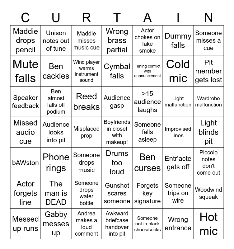 This bingo card has a free space and 48 words: Forgets key signature, Cold mic, Awkward briefcase handover into pit, Audience looks into pit, Reed breaks, Light blinds pit, Unison notes out of tune, Gabby messes up, Dummy falls, Drums too loud, Someone misses a cue, Wrong brass partial, Light malfunction, >15 audience laughs, Actor forgets line, Improvised lines, Mute falls, Pit member gets lost, Someone trips on wire, Actor chokes on fake smoke, Tuning conflict with announcement, Misplaced prop, Maddie drops pencil, Ben cackles, Woodwind squeak, Wind player warms instrument sound, Wardrobe malfunction, Messed up runs, Audience gasp, Ben almost falls off podium, Wrong entrance, Someone falls asleep, Piccolo notes don't come out, The man is DEAD, Missed audio cue, Ben curses, Entr'acte gets off, Speaker feedback, Someone drops music, Someone drops water bottle, bAWston, Hot mic, Maddie misses music cue, Andrea makes a loud comment, Cymbal falls, Gunshot scares someone, Phone rings and Someone not in black shoes/socks.