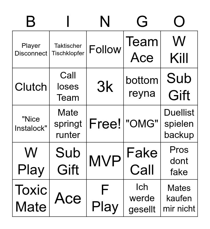This bingo card has a free space and 24 words: Sub Gift, Ace, 3k, Toxic Mate, W Kill, Player Disconnect, Clutch, Taktischer Tischklopfer, "OMG", MVP, bottom reyna, "Nice Instalock", Fake Call, Pros dont fake, Call loses Team, Ich werde gesellt, Duellist spielen backup, Follow, Sub Gift, Mate springt runter, Mates kaufen mir nicht, W Play, Team Ace and F Play.