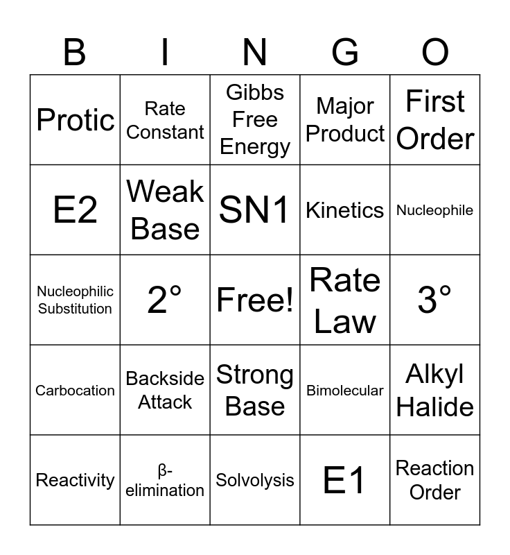 This bingo card has a free space and 25 words: Backside Attack, Solvolysis, SN1, Reactivity, First Order, Protic, E2, Rate Constant, Rate Law, Strong Base, Kinetics, Nucleophilic Substitution, Bimolecular, Alkyl Halide, Weak Base, Activation Energy, 3°, Gibbs Free Energy, Nucleophile, 2°, Reaction Order, β-elimination, Carbocation, Major Product and E1.