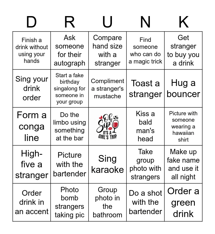 This bingo card has a free space and 24 words: Picture with the bartender, Photo bomb strangers taking pic, Compliment a stranger's mustache, Order drink in an accent, Get stranger to buy you a drink, Finish a drink without using your hands, Sing your drink order, Ask someone for their autograph, Kiss a bald man's head, Sing karaoke, Toast a stranger, Form a conga line, Take group photo with strangers, Make up fake name and use it all night, Start a fake birthday singalong for someone in your group, Do a shot with the bartender, Picture with someone wearing a hawaiian shirt, Compare hand size with a stranger, Hug a bouncer, Do the limbo using something at the bar, Order a green drink, High-five a stranger, Find someone who can do a magic trick and Group photo in the bathroom.