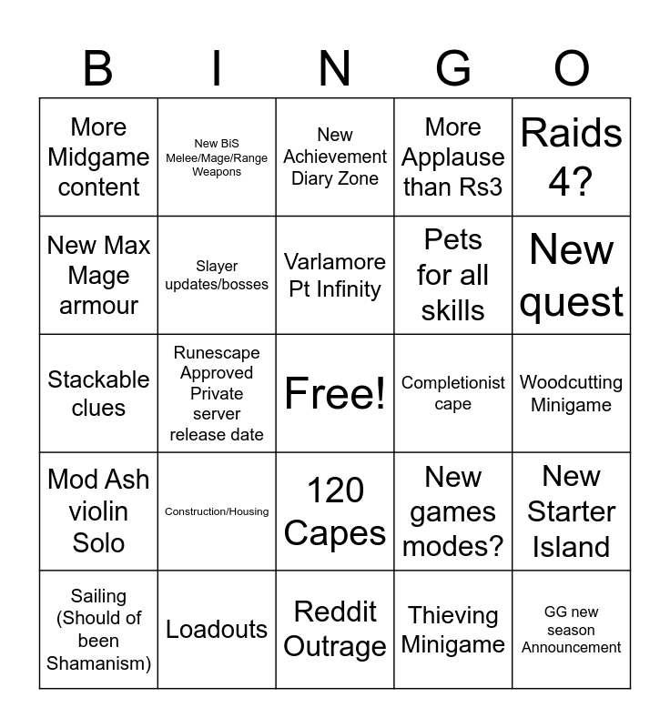 This bingo card has a free space and 24 words: Construction/Housing, Loadouts, Varlamore Pt Infinity, Sailing (Should of been Shamanism), Raids 4?, More Midgame content, New Max Mage armour, New BiS Melee/Mage/Range Weapons, Completionist cape, 120 Capes, Pets for all skills, Stackable clues, New games modes?, New Starter Island, Slayer updates/bosses, Thieving Minigame, Woodcutting Minigame, New Achievement Diary Zone, New quest, Runescape Approved Private server release date, GG new season Announcement, Mod Ash violin Solo, More Applause than Rs3 and Reddit Outrage.