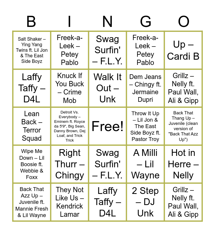 This bingo card has a free space and 55 words: Lose Control – Missy Elliott ft. Ciara & Fatman Scoop, Back That Azz Up – Juvenile ft. Mannie Fresh & Lil Wayne, Get Low – Lil Jon & The East Side Boyz ft. Ying Yang Twins, Salt Shaker – Ying Yang Twins ft. Lil Jon & The East Side Boyz, Laffy Taffy – D4L, Lean Back – Terror Squad, Knuck If You Buck – Crime Mob, Wipe Me Down – Lil Boosie ft. Webbie & Foxx, Dem Jeans – Chingy ft. Jermaine Dupri, Drop It Like It’s Hot – Snoop Dogg ft. Pharrell, Freek-a-Leek – Petey Pablo, Yeah! – Usher ft. Lil Jon & Ludacris, Buy U a Drank – T-Pain ft. Yung Joc, I’m in Love with a Stripper – T-Pain, Right Thurr – Chingy, They Not Like Us – Kendrick Lamar, Up – Cardi B, Detroit Vs. Everybody – Eminem ft. Royce da 5'9", Big Sean, Danny Brown, Dej Loaf, and Trick Trick, Tipsy – J-Kwon, Grillz – Nelly ft. Paul Wall, Ali & Gipp, Throw It Up – Lil Jon & The East Side Boyz ft. Pastor Troy, Get Ur Freak On – Missy Elliott, A Milli – Lil Wayne, Swag Surfin' – F.L.Y., Blow the Whistle – Too $hort, Walk It Out – Unk, 2 Step – DJ Unk, Twerkulator – City Girls, Back That Thang Up – Juvenile (clean version of "Back That Azz Up"), Hot in Herre – Nelly, Lose Control – Missy Elliott ft. Ciara & Fatman Scoop, Back That Azz Up – Juvenile ft. Mannie Fresh & Lil Wayne, Get Low – Lil Jon & The East Side Boyz ft. Ying Yang Twins, Salt Shaker – Ying Yang Twins ft. Lil Jon & The East Side Boyz, Laffy Taffy – D4L, Lean Back – Terror Squad, Knuck If You Buck – Crime Mob, Wipe Me Down – Lil Boosie ft. Webbie & Foxx, Dem Jeans – Chingy ft. Jermaine Dupri, Drop It Like It’s Hot – Snoop Dogg ft. Pharrell, Freek-a-Leek – Petey Pablo, Yeah! – Usher ft. Lil Jon & Ludacris, Buy U a Drank – T-Pain ft. Yung Joc, I’m in Love with a Stripper – T-Pain, Right Thurr – Chingy, They Not Like Us – Kendrick Lamar, Up – Cardi B, Detroit Vs. Everybody – Eminem ft. Royce da 5'9", Big Sean, Danny Brown, Dej Loaf, and Trick Trick, Tipsy – J-Kwon, Grillz – Nelly ft. Paul Wall, Ali & Gipp, Throw It Up – Lil Jon & The East Side Boyz ft. Pastor Troy, Get Ur Freak On – Missy Elliott, A Milli – Lil Wayne, Swag Surfin' – F.L.Y. and Blow the Whistle – Too $hort.