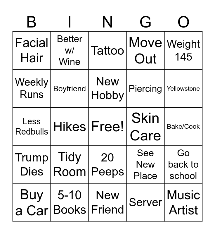 This bingo card has a free space and 24 words: Tidy Room, 5-10 Books, New Hobby, Buy a Car, Weight 145, Facial Hair, Weekly Runs, Better w/ Wine, Skin Care, 20 Peeps, Piercing, Less Redbulls, See New Place, Go back to school, Boyfriend, Server, Bake/Cook, Tattoo, Yellowstone, Hikes, Music Artist, Trump Dies, Move Out and New Friend.