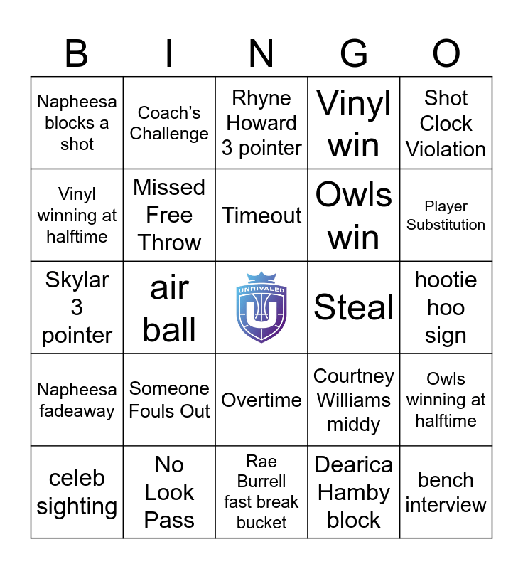 This bingo card has a free space and 33 words: player yells "and one!!" and actually gets the call, coach technical foul, air ball, Skylar stare down, Napheesa fadeaway, Missed Free Throw, Shot Clock Violation, celeb sighting, Coach’s Challenge, Free Throw Made, Timeout, Rhyne Howard 3 pointer, Official Review, Allisha Gray fixes her goggles, Steal, Player Substitution, No Look Pass, Skylar 3 pointer, Someone Fouls Out, Courtney Williams middy, Overtime, Buzzer Beater, Napheesa blocks a shot, hootie hoo sign, Rae Burrell fast break bucket, bench interview, Vinyl win, Owls win, Vinyl winning at halftime, Owls winning at halftime, Vinyl first to 10 points, Dearica Hamby block and T-Spoon wearing glasses.