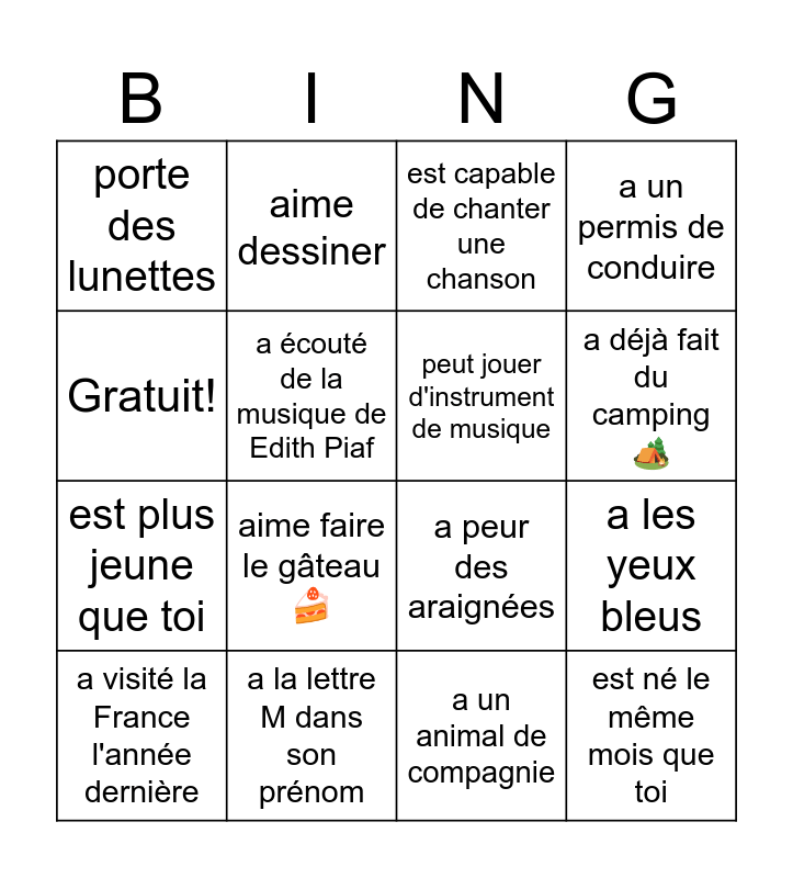 This bingo card has 16 words: a la lettre M dans son prénom, a les yeux bleus, est capable de chanter une chanson, porte des lunettes, est plus jeune que toi, aime dessiner, a peur des araignées, a un animal de compagnie, Gratuit!, a écouté de la musique de Edith Piaf, a visité la France l'année dernière, a un permis de conduire, aime faire le gâteau 🍰, a déjà fait du camping 🏕️, peut jouer d'instrument de musique and est né le même mois que toi.