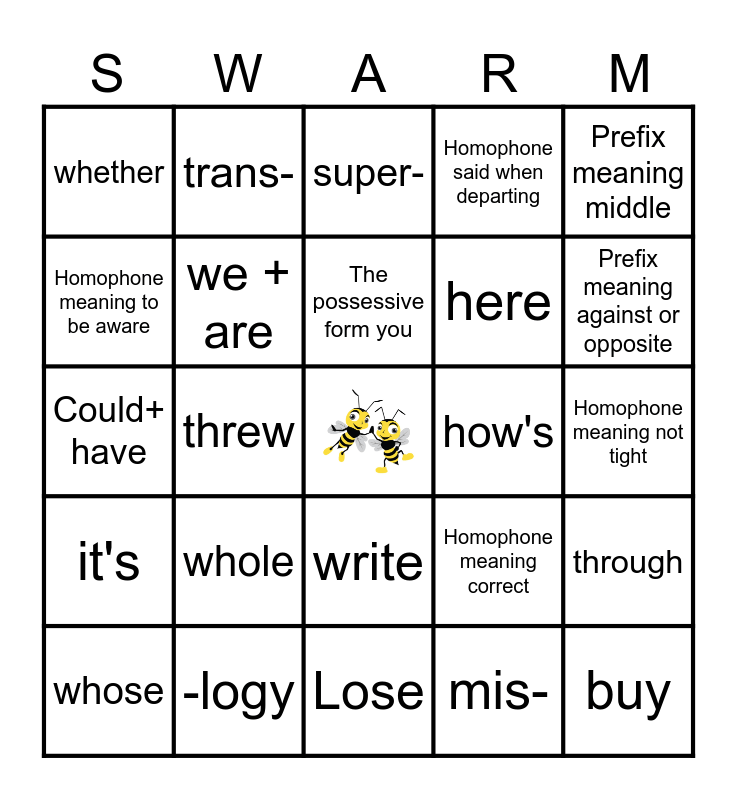 This bingo card has a free space and 34 words: I'm, mis-, too, its, it's, we + are, Prefix meaning middle, whose, trans-, You+are, The possessive form you, super-, Prefix meaning half of/partially, are+not, how's, Prefix meaning against or opposite, -logy, Could+ have, whole, Homophone meaning correct, write, Homophone meaning the state of the atmosphere, whether, Homophone meaning not tight, Lose, buy, Homophone said when departing, hear, here, Homophone meaning to be aware, Homophone meaning the opposite of yes, threw, through and inter-.