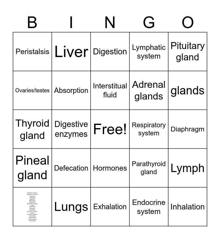 This bingo card has a free space and 29 words: Digestive System Digestive enzymes Ingestion Peristalsis Digestion Absorption Defecation Respiratory system Lungs Diaphragm Inhalation Exhalation Endocrine system glands Endocrine glands Hormones Pineal gland Pituitary gland Thyroid glan, Digestive System, Digestive enzymes, Ingestion, Peristalsis, Digestion, Absorption, Defecation, Respiratory system, Lungs, Diaphragm, Inhalation, Exhalation, Endocrine system, glands, Endocrine glands, Hormones, Pineal gland, Pituitary gland, Thyroid gland, Parathyroid gland, Pancreas, Adrenal glands, Ovaries/testes, Lymphatic system, Liver, Lymph, Interstitual fluid and Lymph nodes.