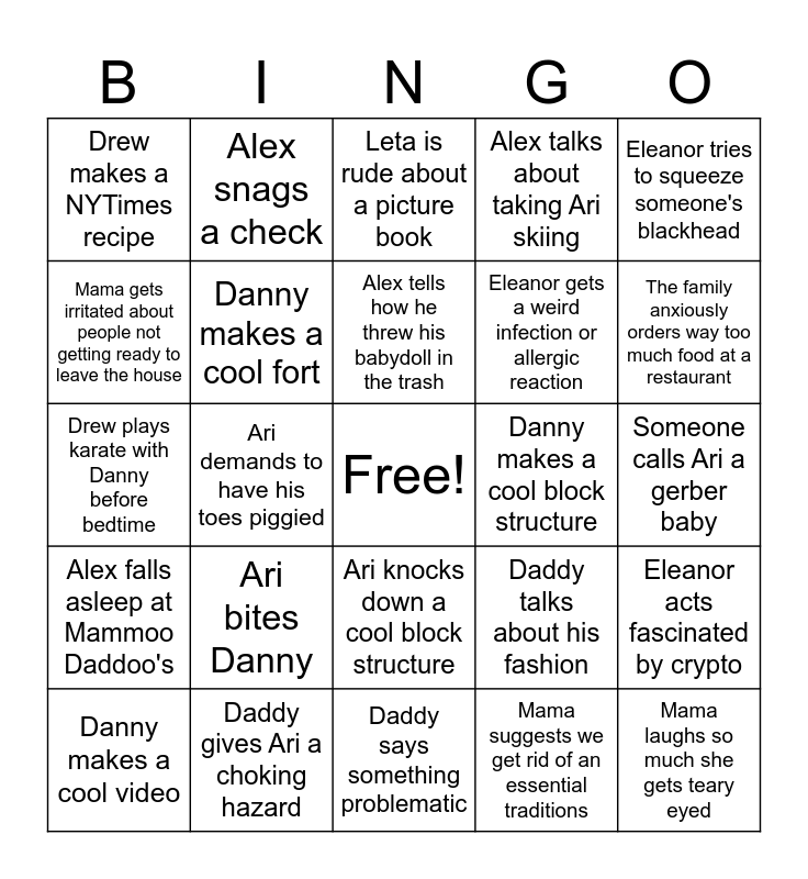 This bingo card has a free space and 24 words: Ari bites Danny, Daddy gives Ari a choking hazard, Alex tells how he threw his babydoll in the trash, Danny makes a cool video, Eleanor tries to squeeze someone's blackhead, Drew makes a NYTimes recipe, Mama gets irritated about people not getting ready to leave the house, Alex snags a check, Danny makes a cool block structure, Ari knocks down a cool block structure, Eleanor gets a weird infection or allergic reaction, Drew plays karate with Danny before bedtime, Daddy talks about his fashion, Eleanor acts fascinated by crypto, Danny makes a cool fort, Mama suggests we get rid of an essential traditions, Someone calls Ari a gerber baby, Leta is rude about a picture book, The family anxiously orders way too much food at a restaurant, Ari demands to have his toes piggied, Mama laughs so much she gets teary eyed, Alex falls asleep at Mammoo Daddoo's, Alex talks about taking Ari skiing and Daddy says something problematic.
