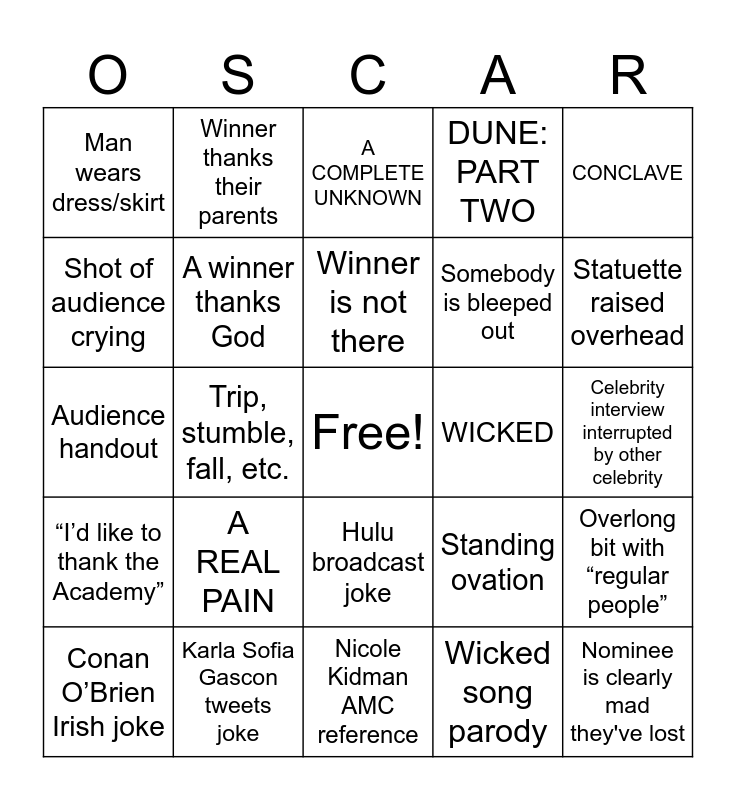 This bingo card has a free space and 43 words: ANORA, Nominee is clearly mad they've lost, Announcer stumbles over winner's name, Conan O’Brien Irish joke, THE BRUTALIST, Wicked song parody, A COMPLETE UNKNOWN, Will Smith slap joke, CONCLAVE, Karla Sofia Gascon tweets joke, DUNE: PART TWO, WICKED, Hulu broadcast joke, A REAL PAIN, I’M STILL HERE, Nicole Kidman AMC reference, FLOW, Audience handout, NOSFERATU, Statuette raised overhead, Winner thanks their parents, Harrison Ford Red Hulk joke, “Holding space” joke, Man wears dress/skirt, Nail tech is shouted out, Celebrity interview interrupted by other celebrity, TikTokker red carpet correspondent, Paul Rudd Mac & Me bit, Standing ovation, “I’d like to thank the Academy”, Winner gets played off, Overlong bit with “regular people”, EMILIA PEREZ, Trip, stumble, fall, etc., Meryl Streep is seen/mentioned, Telling kids to go to bed, Reading glasses for speech, Winner is not there, Shot of audience crying, Somebody is bleeped out, Show continues past 10:30 PM, A winner thanks God and THE SUBSTANCE.