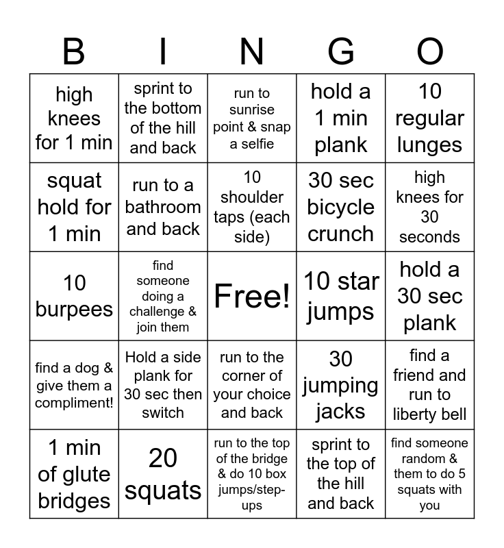 This bingo card has a free space and 24 words: Hold a side plank for 30 sec then switch, 20 squats, 10 shoulder taps (each side), 1 min of glute bridges, 10 regular lunges, high knees for 1 min, squat hold for 1 min, sprint to the bottom of the hill and back, 10 star jumps, run to the corner of your choice and back, 30 sec bicycle crunch, 10 burpees, 30 jumping jacks, find a friend and run to liberty bell, run to a bathroom and back, sprint to the top of the hill and back, hold a 30 sec plank, run to sunrise point & snap a selfie, high knees for 30 seconds, find someone doing a challenge & join them, find someone random & them to do 5 squats with you, find a dog & give them a compliment!, hold a 1 min plank and run to the top of the bridge & do 10 box jumps/step-ups.
