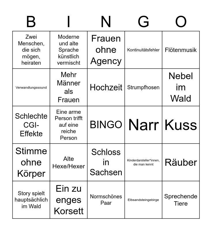 This bingo card has a free space and 26 words: Schloss in Sachsen, Elbsandsteingebirge, Hochzeit, Ein zu enges Korsett, Flötenmusik, Zwei Menschen, die sich mögen, heiraten, Verwandlungssound, Moderne und alte Sprache künstlich vermischt, Kuss, Kinderdarsteller*innen, die man kennt, Strumpfhosen, Schlechte CGI-Effekte, Räuber, Story spielt hauptsächlich im Wald, Eine arme Person trifft auf eine reiche Person, Schlechtes Schauspiel, Kontinuitätsfehler, Stimme ohne Körper, Frauen ohne Agency, Sprechende Tiere, Nebel im Wald, Normschönes Paar, Narr, Alte Hexe/Hexer, Mehr Männer als Frauen and Frau(en) muss/müssen etwas tun, um einen Mann (Männer) zu retten.