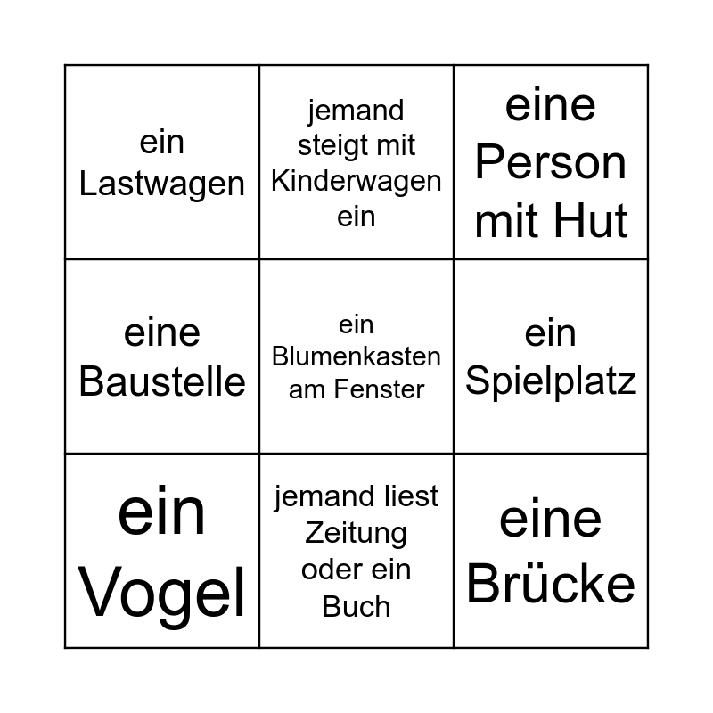 This bingo card has 12 words: ein Hund an der Leine, eine Brücke, ein Blumenkasten am Fenster, ein Spielplatz, jemand steigt mit Kinderwagen ein, eine Person mit Hut, jemand liest Zeitung oder ein Buch, ein rotes Auto, ein Lastwagen, eine Baustelle, ein Vogel and ein Supermarkt.