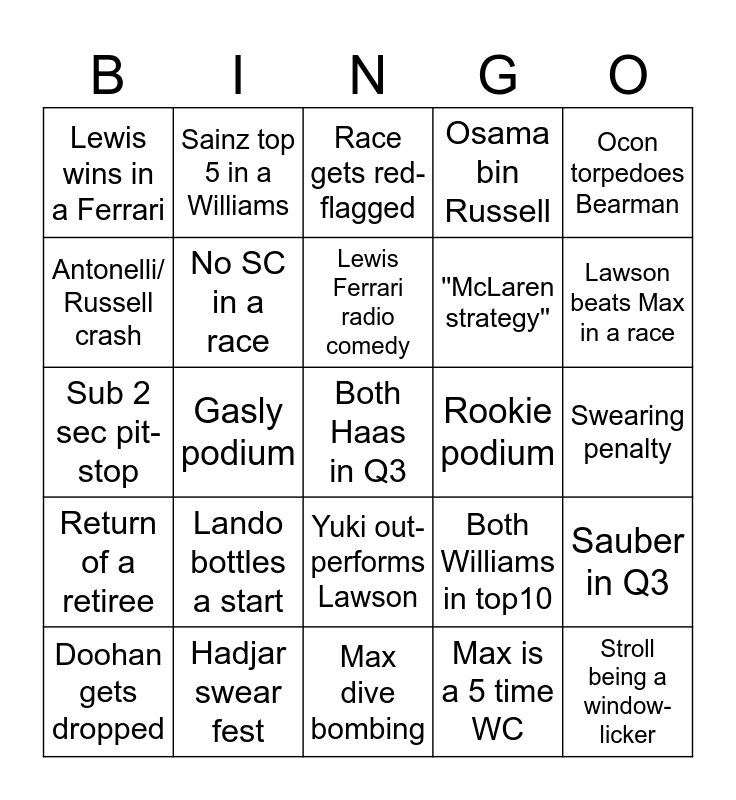 This bingo card has 25 words: Lando bottles a start, Max dive bombing, Lewis Ferrari radio comedy, Doohan gets dropped, Ocon torpedoes Bearman, Lewis wins in a Ferrari, Antonelli/ Russell crash, Sainz top 5 in a Williams, Rookie podium, Yuki out-performs Lawson, ''McLaren strategy'', Sub 2 sec pit-stop, Both Williams in top10, Sauber in Q3, No SC in a race, Stroll being a window- licker, Swearing penalty, Race gets red-flagged, Lawson beats Max in a race, Gasly podium, Both Haas in Q3, Hadjar swear fest, Return of a retiree, Osama bin Russell and Max is a 5 time WC.