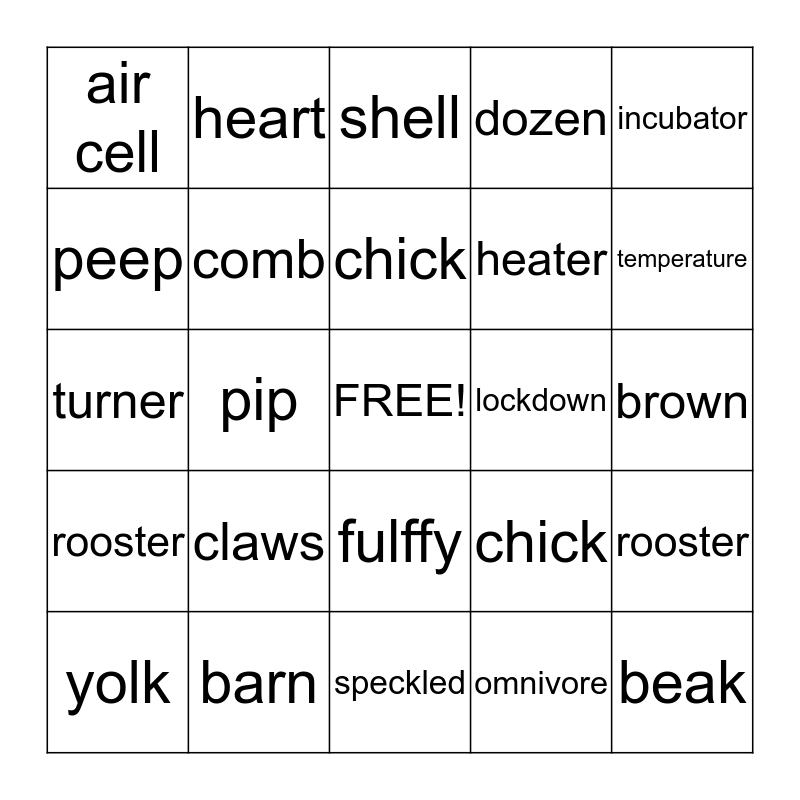 This bingo card has a free space and 24 words: claws, barn, chick, yolk, incubator, air cell, peep, heart, lockdown, fulffy, heater, turner, chick, rooster, comb, omnivore, brown, shell, temperature, pip, beak, rooster, dozen and speckled.